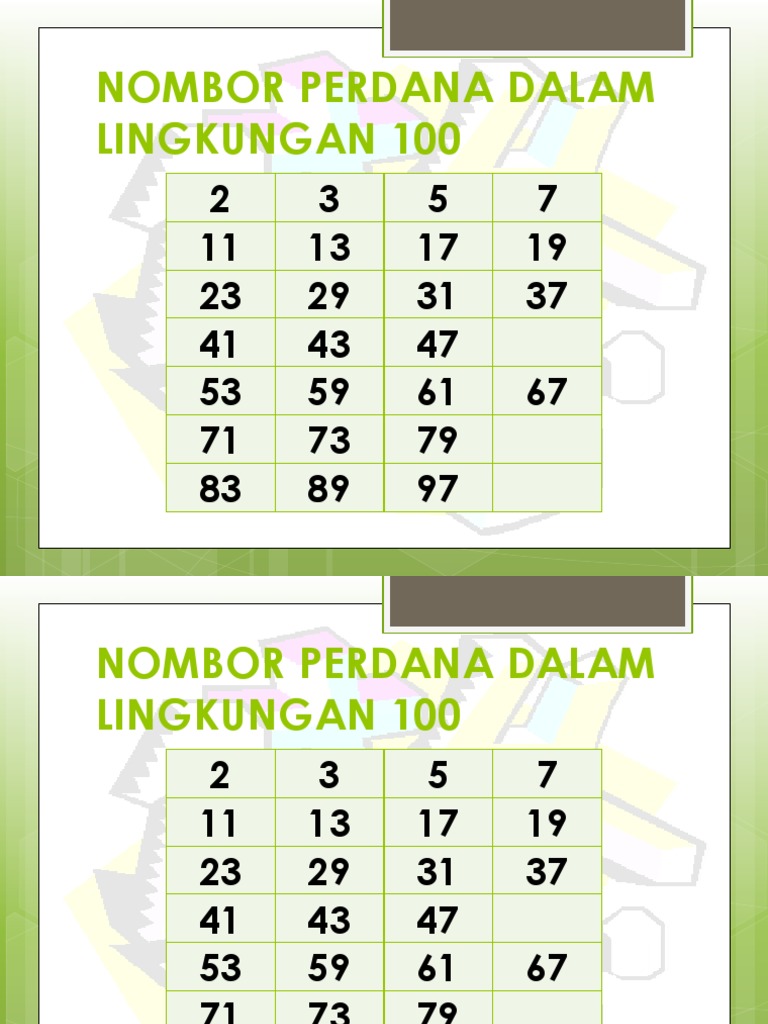 Jadi kali ni panitia matematik nak kongsi dengan semua apa itu nombor perdana. Senaraikan semua nombor perdana antara 0 hingga 20. Dalam matematik, nombor perdana adalah nombor asli yang lebih besar daripada 1, yang faktor pembahaginya cuma 1 dan bilangan itu sendiri. Download lagu nombor perdana tahun 6 1.25mb dan streaming kumpulan lagu nombor perdana tahun 6 1.25mb mp3 terbaru di metrolagu hasil diatas adalah hasil pencarian dari anda nombor perdana tahun 6 mp3 dan menurut kami yang paling cocok adalah nombor perdana tahun 6. Nombor perdana (prime number) adalah nombor bulat yang hanya boleh dibahagikan dengan dirinya sendiri dan nombor 1 (the number itself and number 1).