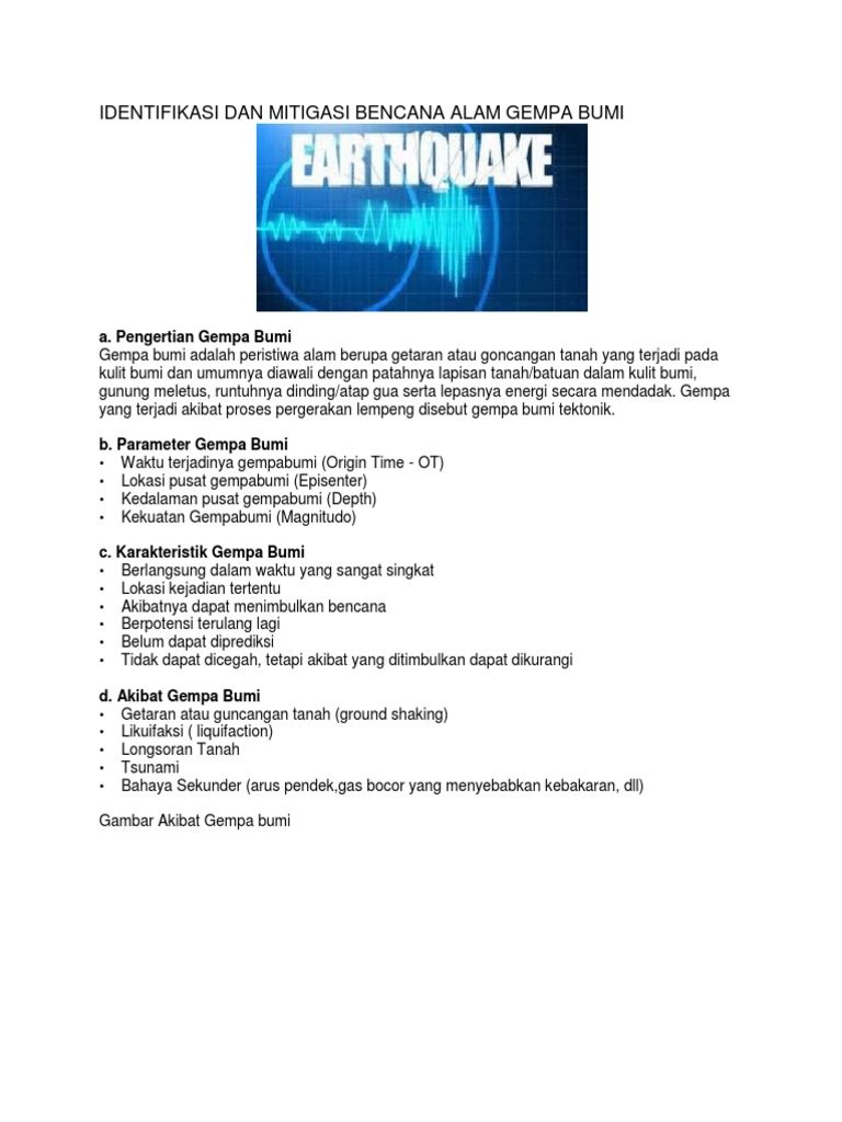 Gempa bumi adalah salah satu bencana alam yang sering melanda indonesia karena letak geologinya yang berada di zona subduksi lempeng tektonik. Gempa bumi adalah akibat dari bergesernya lempengan bumi. Bencana alam merupakan momok bagi semua warga, kejadian yang sangat tragis dan memilukan dimana selalu menimbulkan banyak korban baik itu korban jiwa. Gempa bumi adalah pergerakan permukaan bumi akibat gelombang yang disebabkan oleh pelepasan energi dari dalam. Gempa bumi dibagi menjadi beberapa tipe, yaitu gempa bumi tektonik, gempa bumi vulkanik, gempa bumi runtuhan, gempa bumi tumbukan, dan gempa bumi buatan. Tumbukan ini akan menghasilkan getaran. Pergeseran tersebut akan menimbulkan guncangan gelombang seismik yang saling berbenturan, mengakibatkan getaran pada tanah yang dikenal dengan gempa bumi. Upaya mengatasi terjadinya gempa bumi a. Pagesbusinessescommercial & industrialenvironmental servicegeologic serviceinfo gempa bumi dan bencana alam. Juga dapat membahayakan kehidupan makhluk hidup yang tinggal di dalamnya. Energi ini dapat berasal dari tumbukan antar lempeng bumi, patahan aktif, aktivitas gunung berapi, runtuhan batuan. Biasanya disebabkan oleh pergerakan kerak bumi yaitu lempeng bumi. · jangan panik dan jangan berlari kel.