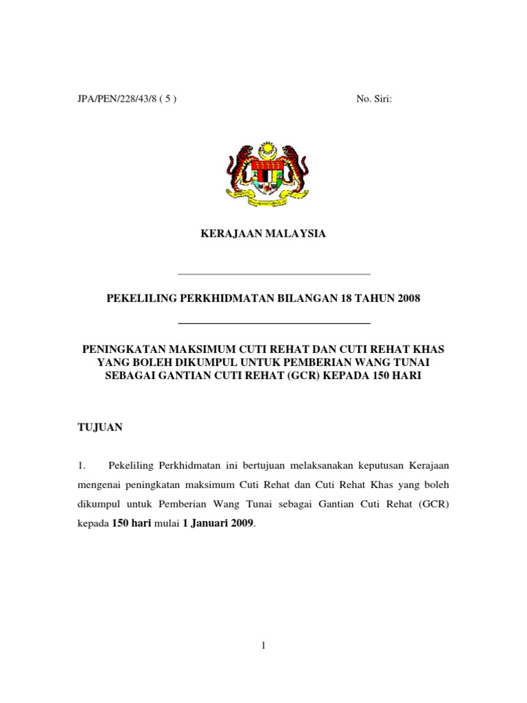 Pemberian Wang Tunai Gantian Cuti Rehat from demo.pdfslide.net Kadar cuti rehat tahunan dan tawaran opsyen kepada pegawai perkhidmatan awam bil.18/2008 : Surat pekeliling perkhidmatan bilangan 2 tahun 2017, kebenaran gantian cuti rehat melebihi 150 hari digunakan sebagai cuti rehat pada tahun persaraan ini bertujuan untuk melaksanakan keputusan kerajaan bagi membenarkan gcr yang dikumpul melebihi 150 hari digunakan sebagai. Dibawa ke tahun hadapan lampiran a kebenaran daripada ketua jabatan untuk mengumpul cuti rehat bagi gcr di bawah pekeliling perkhidmatan bilangan 5 tahun 2004. 150 hari gcr = 12 hari x 13 thn. Hari adalah dibenarkan dikumpulkan bagi gcr, manakala. Gcr sebanyak 150 hari adalah layak kepada semua pegawai/kakitangan lantikan tetap memilih untuk kekal dengan kadar cuti rehat (cr) semasa ataupun bersetuju memilih opsyen baru ( pp bil. China hulur bantuan kepada lebih 150 negara. Closure of exchange for hari raya aidilfitri.
