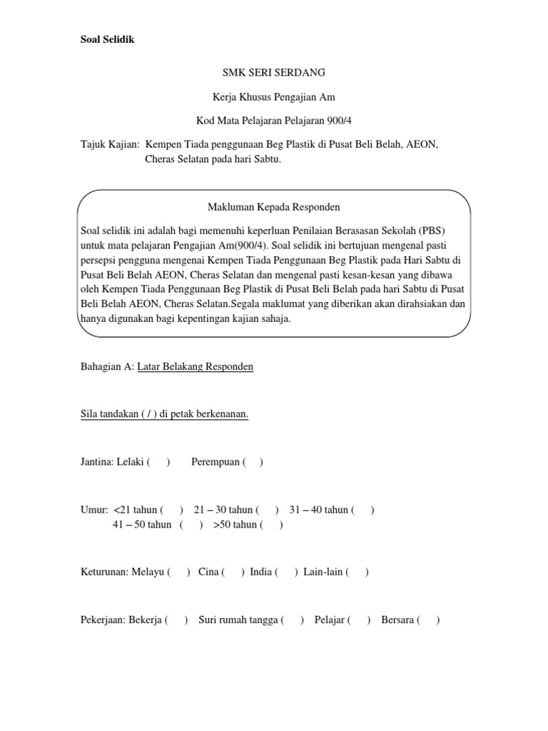 Trainees2013: Borang Soal Selidik Kerja Kursus Pengajian ... from 0.academia-photos.com Kerja kursus ini wajib dilaksanakan oleh calon stpm, iaitu calon sekolah kerajaan, calon sekolah banttuan kerajaan,c alon sekolah swasta dan calon persendirian individu sebagai sebahagian komponen penilaian penggal 2. 3.1.3 tema kerja kursus pengajian am tahun 2020 adalah berdasarkan tajuk yang dipelajari dalam semester 2. Daripada 12 orang responden lelaki, 8.33% (1 orang) responden lelaki sangat tidak setuju dengan faktor tersebut. Selain itu, tidak lupa juga dititipkan rasa penghargaan terhadap jasa guru matapelajaran pengajian am kami kerana memberi bimbingan untuk mencari. Pembentangan kerja kursus pengajian am kod mata pelajaran 900/4 nama : Berikut dikongsikan adalah maklumat tentang kerja kursus pengajian am stpm yang memaparkan tema kerja kursus pilih satu daripada tema di bawah ini dan sediakan kerja kursus yang panjangnya tidak melebihi 5000 patah perkataan. 5.8 setiap helaian kertas jawapan kerja kursus hendaklah dicatatkan nombor kad pengenalan di bahagian atas sebelah kanan kertas tersebut (nama calon tidak perlu). Kerja kursus (kerja projek) ini wajib dilaksanakan oleh calon stpm, iaitu calon sekolah kerajaan, calon sekolah bantuan kerajaan, calon sekolah swasta, dan calon persendirian individu sebagai sebahagian.